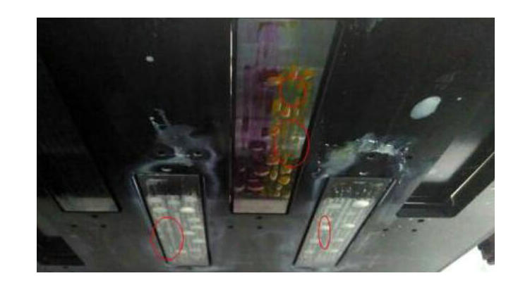 1. 壓墨發現局部噴嘴墨水很難出來。如下圖,紅色圈起來的地方,壓墨時墨水難出來,而其它地方良好。這是噴嘴表麵幹燥造成的。可以用邊壓墨邊擦噴嘴的方法,用壓出的墨水濕潤堵塞的孔。在操作過程中,需要注意必須使用細軟的無塵布,視噴頭表麵幹燥情況可適當沾上清洗液擦拭,不要直接用幹布擦拭,避免損壞UV打印機的噴頭。
